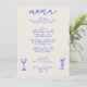 A unique retro blue modern hand drawn written wedding dinner menu. Which features chic template design of boho vintage cream background and blue hand written text layout. Perfect and matching with the whole suite. And hand drawn glasses.