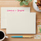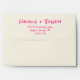 A retro modern hand written bright colourful wedding envelope. Which features bold bride and groom's names in vivid pink colour. And personalised return address . On simple pale beige cream vintage colour background. Which suits the whole wedding suite.