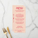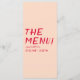 A colourful retro funky modern peachy red bold wedding dinner menu. Which features a chic template design of a boho peachy background bright red magenta typography and a handwritten menu in red. Perfect and matching with the whole suite.