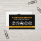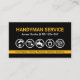 A black cover features a yellow stripe near the base of the card. Over at the top is the business name "HANDYMAN SERVICE" alongside the contact details. This is followed by a handyman tools design where the tools can represent some of the services that you offer e.g. the drill-measuring tape can represent home repairs, remodeling etc. Inside the yellow stripe is the list of services which you can change.