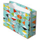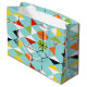 This Retro Harlequin Pattern Gift Bag is mid century modern style at its finest. The vintage inspired design features an aqua background with rows of triangular shapes forming a harlequin pattern. The two-toned diamond shapes are yellow, white, red, orange, black, green, and white with black accents. But wait, there’s more! There are also orange ovals, green ovals with black starbursts, and outlines of black diamonds. Time marches on, but you’ll feel like you’ve found a kitschy blast from the past with this colourful geometric treasure.