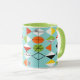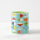 This Retro Harlequin Pattern Ringer Mug is mid century modern style at its finest. The vintage inspired design features an aqua background with rows of triangular shapes forming a harlequin pattern. The two-toned diamond shapes are yellow, white, red, orange, black, green, and white with black accents. But wait, there’s more! There are also orange ovals, green ovals with black starbursts, and outlines of black diamonds. Time marches on, but you’ll feel like you’ve found a kitschy blast from the past with this colourful geometric treasure.