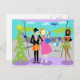 Mele Kalikimaka! This Retro Hawaiian Christmas Postcard features a minimalist cartoon drawing of an attractive couple taking the holiday trip of a lifetime! The mid century modern scene is set in a tropical airport. Mr. and Mrs. Tourist are posing in front of the floor to ceiling glass walls. After all, they want to document every moment of their vacation to paradise. Mr. Tourist is dressed in a black suit, light blue shirt, red tie, and black fedora. He is holding an orange suitcase. His arm is around his beautiful bride. She is wearing a hot pink dress. A bright blue handbag is slung over one arm. A Santa hat is gracing her blonde head. It wouldn't do to travel by air and not look your best! Both of them are wearing colourful flower leis around their necks. Beside them, we see a stunning, golden skinned hula girl with flowing black hair. Miss Hula is wearing a traditional grass skirt. Her hula top has a festive twist, however. Her bikini top is red with white trim. Eat your heart our, Mrs. Claus! Instead of a flower, she is wearing a sprig of holly in her hair. On one arm, she has an extra Hawaiian lei ready to offer the next person to step off the plane. Ah, can't you smell the orchids now? On the opposite side of the couple, there is a Christmas tree that has been given an island makeover. The happy cedar is decked out with pastel seashells and starfish. On the opposite side of the glass, we can see the luxury, jumbo jetliner that brought the couple to their vacation destination. On the tarmac, 1960's style flight attendant is making her way to the building. She is wearing a form fitting, blue uniform and a blue pillbox hat. Yowza! That gorgeous blonde can offer me coffee, tea, or milk anytime! The sky a shade of aqua that makes you want to reach for the suntan oil! We can see the green silhouettes of palm trees and the dark blue silhouette of a plane flying among the fluffy, light blue clouds. Oh, I hope those poor suckers on that plane aren't on their way back to the daily grind! Aloha!