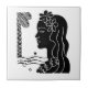 A black and white Hawaiian scene with the head of a hula girl; and a palm tree in the background.