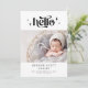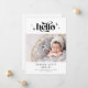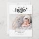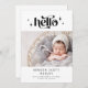 Retro and minimalistic birth announcement card featuring text at the top that says "hello" in bold swirly font with stars.