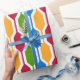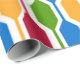 This wrapping paper is covered with a mid-century modern design of retro hexagons in red, gold, blue, green. Fun design.
