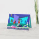 This Customisable Retro Holiday Cartoon Party Christmas Card will put you in the holiday spirit. The design features the exterior of a mid century modern house. Through the floor to ceiling turquoise glass walls, we can see the navy blue silhouettes of festive party goers. There is a couple chatting in front of a green Christmas tree, which is decorated with teal ornaments. On the opposite side of the room, we can see a dancing man and the long-winded man everyone is trying to avoid. The exterior of the house features a cheery red door with a holiday wreath, an oversize purple brick fireplace, and strands of colourful Christmas lights. A grey walkway is cutting a swath to the front door, through the teal grass. The nighttime scene has a dark blue sky with a yellow, crescent moon. The plastic snowman decorating the front yard is being greeted by the first snow flurries of the season. An attractive couple is doing the cha-cha-cha on the way to their car. The blonde woman is wearing a bright red dress. She is holding a sprig of mistletoe in one hand. Her handsome escort is wearing a black suit and a red tie. His hands are wrapped around the woman's waist. On the street, in front of the house, we can see three, brightly coloured classic cars. The inside of the card features two, yellow starbursts surrounding the words, "Happy Holidays," but you can personalise the card however you wish. Order today and party like it's 1959!