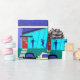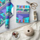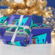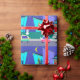 This Retro Holiday Cartoon Party Christmas Wrapping Paper will put you in the holiday spirit. The design features the exterior of a mid century modern house. Through the floor to ceiling turquoise glass walls, we can see the navy blue silhouettes of festive party goers. There is a couple chatting in front of a green Christmas tree, which is decorated with teal ornaments. On the opposite side of the room, we can see a dancing man and the long-winded man everyone is trying to avoid. The exterior of the house features a cheery red door with a holiday wreath, an oversize purple brick fireplace, and strands of colourful Christmas lights. A grey walkway is cutting a swath to the front door, through the teal grass. The nighttime scene has a dark blue sky with a yellow, crescent moon. The plastic snowman decorating the front yard is being greeted by the first snow flurries of the season. An attractive couple is doing the cha-cha-cha on the way to their car. The blonde woman is wearing a bright red dress. She is holding a sprig of mistletoe in one hand. Her handsome escort is wearing a black suit and a red tie. His hands are wrapped around the woman's waist. On the street, in front of the house, we can see three, brightly coloured classic cars. Order today and party like it's 1959!