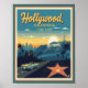 5 star quality retro poster of Hollywood California (Tinsel Town) featuring nostalgic mid-century colours, along with famous Hollywood sign and the Hollywood Walk of Fame.