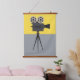 Wall tapestry features a retro Hollywood tripod style movie making camera on a modern yellow and grey colorblock background