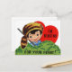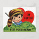 This postcard features a retro illustration of a boy with a Davy Crockett hat who is in the bushes. There is a heart behind him. The message says, "I'm hunting for your heart".