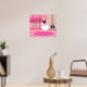 This Retro In the Pink Poster looks like a scene out of a 1960's romantic comedy. The minimalist design shows a sophisticated woman in her ultra kitschy and ultra pink, penthouse apartment. The room features a pink brick wall with white grout lines. In front of the wall, there is a green cone fireplace with a roaring fire. Through sliding glass doors we see a pink balcony with a white railing. A lush, tropical plant is in an aqua flowerpot. The view from the balcony is of a silhouette of a big city skyline. Of course, the silhouette is in shades of pink! A yellow, crescent moon is in the sky. Standing on a hot pink, shag rug in the apartment is the leading lady of this design. In stark contrast to the rosy world she has created, the beautiful blonde is wearing a form fitting, black, scoop-necked top with a long, flared, white skirt with black feather embellishments. With this design, you too can be looking at the world through rose colored glasses!