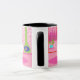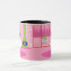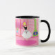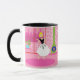 This Retro In the Pink Ringer Mug looks like a scene out of a 1960's romantic comedy. The minimalist design shows a sophisticated woman in her ultra kitschy and ultra pink, penthouse apartment. The room features a pink brick wall with white grout lines. In front of the wall, there is a green cone fireplace with a roaring fire. Through sliding glass doors we see a pink balcony with a white railing. A lush, tropical plant is in an aqua flowerpot. The view from the balcony is of a silhouette of a big city skyline. Of course, the silhouette is in shades of pink! A yellow, crescent moon is in the sky. Standing on a hot pink, shag rug in the apartment is the leading lady of this design. In stark contrast to the rosy world she has created, the beautiful blonde is wearing a form fitting, black, scoop-necked top with a long, flared, white skirt with black feather embellishments. With this design, you too can be looking at the world through rose coloured glasses!