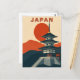 Immerse yourself in the tranquility of the East with this stunning Japan Travel Postcard. This vintage-style design features a majestic multi-tiered pagoda and a traditional Torii gate, set against a massive, bold red sun.