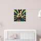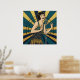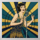 A joyful vintage-inspired illustration of a jazz singer with a classic microphone. Featuring a vibrant blue and metallic gold sunburst background, this elegant cabaret-style poster brings the energy of the Roaring 20s to your home bar, lounge, or music room.