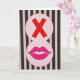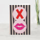 This design shows a tall figure-eight shape running down the center of the card. In the top loop, there’s a strong red “X” that looks crisp and simple. In the bottom loop, a pair of hot pink lips sit slightly open, with small white highlights that make them look glossy. A pale pink outline traces the center shape, and behind it are vertical stripes that alternate black and creamy beige. The whole image has a pixel-like texture, like you’re seeing it on a screen, which gives it a modern, digital feel. There isn’t any other written message on the front besides the red “X,” placed in the upper section. It feels meaningful because it captures that mix of being nervous to speak up and still wanting to show affection, which can be very real in love or friendship 🥰❤️. Hope it helps you share your Valentine’s Day sentiments.