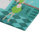 With this Retro Kitchen Cutting Board, you can have your pie and eat it, too. This kitschy, minimalist art drawing features a perfect 1950's housewife, in her mid century modern kitchen. The beautiful baker is wearing a flouncy, green dress and a white apron with red detailing. Not a hair on her blonde head is out of place. In one hand, she is holding the fruit of her labour--a gorgeous, lattice topped, fruit pie. One glance and you'll know that her flaky pie crusts are second to none. She is standing on an aqua and teal chequerboard floor, which is undoubtedly clean enough to eat off of. Against an aqua wall, we see teal cabinetry with aqua trim work, a red countertop, red drawer pulls, and black starburst accents. A red, starburst clock is hanging on the wall. To the side, there is a state of the art, white refrigerator with silver handles. At least, the fridge was state of the art in 1950's. Now, it's just plain dreamy! Whether you're Suzie Homemaker or simply have an affinity for all things vintage, you're sure to love this scrumptious slice of Americana.