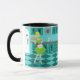With this Retro Kitchen Mug, you can have your pie and eat it, too. This kitschy, minimalist art drawing features a perfect 1950's housewife, in her mid century modern kitchen. The beautiful baker is wearing a flouncy, green dress and a white apron with red detailing. Not a hair on her blonde head is out of place. In one hand, she is holding the fruit of her labour--a gorgeous, lattice topped, fruit pie. One glance and you'll know that her flaky pie crusts are second to none. She is standing on an aqua and teal chequerboard floor, which is undoubtedly clean enough to eat off of. Against an aqua wall, we see teal cabinetry with aqua trim work, a red countertop, red drawer pulls, and black starburst accents. A red, starburst clock is hanging on the wall. To the side, there is a state of the art, white refrigerator with silver handles. At least, the fridge was state of the art in 1950's. Now, it's just plain dreamy! Whether you're Suzie Homemaker or simply have an affinity for all things vintage, you're sure to love this scrumptious slice of Americana.