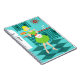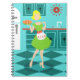 With this Retro Kitchen Spiral Notebook, you can have your pie and eat it, too. This kitschy, minimalist art drawing features a perfect 1950's housewife, in her mid century modern kitchen. The beautiful baker is wearing a flouncy, green dress and a white apron with red detailing. Not a hair on her blonde head is out of place. In one hand, she is holding the fruit of her labour--a gorgeous, lattice topped, fruit pie. One glance and you'll know that her flaky pie crusts are second to none. She is standing on an aqua and teal chequerboard floor, which is undoubtedly clean enough to eat off of. Against an aqua wall, we see teal cabinetry with aqua trim work, a red countertop, red drawer pulls, and black starburst accents. A red, starburst clock is hanging on the wall. To the side, there is a state of the art, white refrigerator with silver handles. At least, the fridge was state of the art in 1950's. Now, it's just plain dreamy! Whether you're Suzie Homemaker or simply have an affinity for all things vintage, you're sure to love this scrumptious slice of Americana.