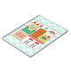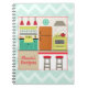 A spiral recipe notebook featuring an illustration of a retro inspired kitchen with a red, turquoise, yellow, and orange colour scheme. Background is blue zig zag. Personalise with your name.