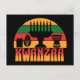 Retro 60-70 feel Kwanzaa with a Kinara, unity cup, corn, and gift in gold, green, red, and black.