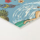 Multicolored retro surf tropical themed graphics on a teal background, seamless repeat pattern