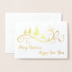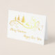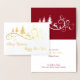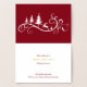 Here's a pretty retro image gold foil Christmas card that has a unique look to it! The gold foil swirl image on the front is embellished with a leaping reindeer and pine trees. Below the image is typographical text that says "Merry Christmas" and "Happy New Year". The inside top of the card is burgundy red, with the same image in white. The bottom of the inside is white with your custom text in matching red and gold. Very distinctive, colourful, and elegant!