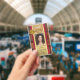 Elegant retro library photo ID badge with space for your custom photo and logo. The design shows a burgundy gold layout on a bookshelf background. On the back you can add a custom bar code or QR code and additional texts or delete the templates.