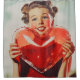 A nostalgic 1950s-inspired image of a smiling young woman holding a glowing, hollow, heart-shaped object. Her vibrant red attire and cheerful expression evoke warmth, joy, and timeless romance, capturing the vintage charm of the era.