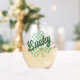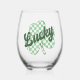 This fun stemless wine glass features a green and white checked shamrock with retro style lettering that says "Lucky" in a distressed green font. Perfect for St. Patrick's Day!