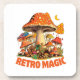 This image depicts a whimsical scene of various mushrooms in a retro style. The prominent mushroom, with its orange cap and white spots, dominates the centre, surrounded by smaller mushrooms of different colours and shapes. The mushrooms are nestled amidst green foliage, with flowers adding a touch of vibrancy to the scene. The word "RETRO MAGIC" is prominently displayed at the bottom, adding a touch of nostalgia and whimsy to the image. The overall effect is playful and inviting, evoking a sense of wonder and enchantment.