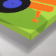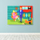 This Retro Martini Couple Stretched Canvas Print looks like a scene out of a romantic comedy. The setting of this 1960's style, minimalist art design is an elegantly decorated, mid century modern house or apartment. The cast is an attractive couple enjoying an evening filled with sparkling conversation, good music and bottomless drinks. The room features a green floor, and an aqua and teal brick wall. Resting comfortably in a mod, orange egg chair is a beautiful woman. Her bright pink dress is just short enough to show off her shapely gams. With the wave of a hand, this blonde beauty has the immediate attention of her male admirer. Her fair haired companion is wearing a blue suit, white shirt and black bow tie. In his hands, he is holding two, crystal martini glasses with floating olives. Don't worry. He's offering one to his lady friend. The pair is having such a delightful time that neither is taking notice of the hour showing on the kitschy, red, starburst clock on the brick wall behind them. On a recessed fiery red wall, there are three Classic Movie Martini Stretched Canvas Prints, also available from StrangeLittleOnion's Zazzle store (hint, hint!) Two of the prints feature turquoise backgrounds and one is on a dramatic black background. Centred beneath the prints is an elegant wet bar. The front of the teal bar has three harlequin diamonds, in shades of orange, turquoise and green. We can see the silhouettes of martini glasses resting on the counter top. Across the room, an orange ottoman is holding a blue and black, portable record player. On the floor, we see the vinyl records and a bright yellow album cover. This attractive duo is having such a delightful time that neither is taking notice of the hour showing on the kitschy, red, starburst clock on the brick wall behind them.