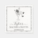 The artwork is set within a modern square frame and surrounded by a delicate black and white botanical floral border. Personalize the design with the bride's name and event date in a sophisticated mix of classic serif and elegant script typography. These napkins are perfect for a trendy weekend getaway, a glamorous bridal shower, or a high-energy bachelorette bash.