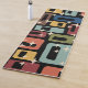 A vibrant abstract grid of rectangles and ovals in rich tones of red, blue, yellow, green, brown, and blue, scattered across a black background and punctuated by crisp white starbursts. The composition evokes mid-century modern design with its bold shapes, rhythmic repetition, and festive sparkle. The interplay of color and contrast creates a dynamic, celebratory mood—perfect for textiles, or graphic design with nostalgic flair and decorative charm.