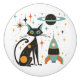 Fun ceramic knob with a retro MCM design with a black cat, turquoise eyes, stars, spaceship and planet Saturn.