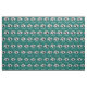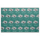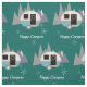 Personalise this fun retro camper trailer fabric with your own text if desired. Repeating offset pattern of camper trailer images, "Happy Campers" script text and mountain backdrop. Turquoise blue and white trailer on dark teal blue.