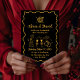 This wedding invitation features an elegant black background and simple gold font design. The disco ball at the top adds a festive feel, with wedding cake icons, champagne glasses and rings at the bottom. The wavy gold frame completes the festive look.