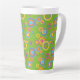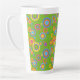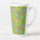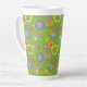 Bright and colourful throwback pattern features multi-ringed circles of a variety of sizes and colours on grass green background.