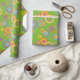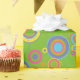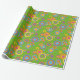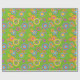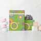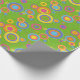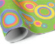 Bright and colourful throwback gift wrap pattern features multi-ringed circles of a variety of sizes and colours on grass green background.