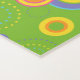 Bright and colourful throwback pattern features multi-ringed circles of a variety of sizes and colours on grass green background.