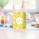 Bright and sunny throwback pattern features white flowers with pink and green centres on yellow background. Personalise this trendy can glass with monogram or name in white and green oval