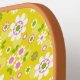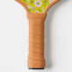 Pretty pickleball paddle features white flowers with pink and green centres on yellow background. Personalise with monogram or name in white and green oval
