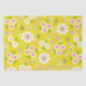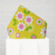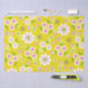 Bright and sunny throwback pattern features white flowers with pink and green centres on yellow background.