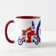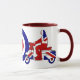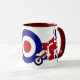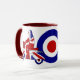 Retro look mod scooter rider outline with union jack british flag design inner on a background of a mod red white and blue target