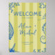 Seaside on the beach fun striped citrus green and blue playful unique wedding welcome sign printable poster featuring hand drawn starfish and ocean corals, and a chic whimsical handwritten calligraphy script. +++++++ All colors are editable. +++++++++ Suitable for retro casual trendy beach coastal summer destination weddings.