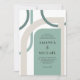 A modern spin on a glamourous art deco vibe of days gone by, this colourful wedding invitation has geometric curved shapes intertwined around the text layout of the invitation. Colours include the popular colour palette of seafoam green and neutral neutral ivory beige shape framing your text. The results are unique and artistic with a retro appeal. This colour palette makes a wonderful choice for coastal beach or destination weddings.