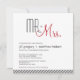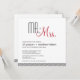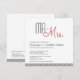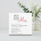 Mid-century modern wedding invitation with a black, white, and red colour palette. The text "Mr. + Mrs." is written at the top of the invite in fun retro typography. Diagonal stripes adorn the bottom of the invite on the front and the back.