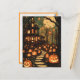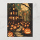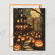 The pathway lined with pumpkins creates a mysterious Halloween atmosphere with a haunted house surrounded by jack-o’-lanterns under a bright full moon.