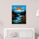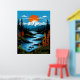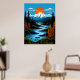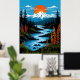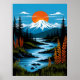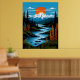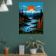 This stylish poster features a colourful and bold illustration of a retro mountain landscape in red, orange, and blue.