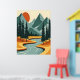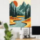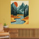 This stylish poster features a colourful and bold illustration of a retro mountain landscape in red, orange, and blue.